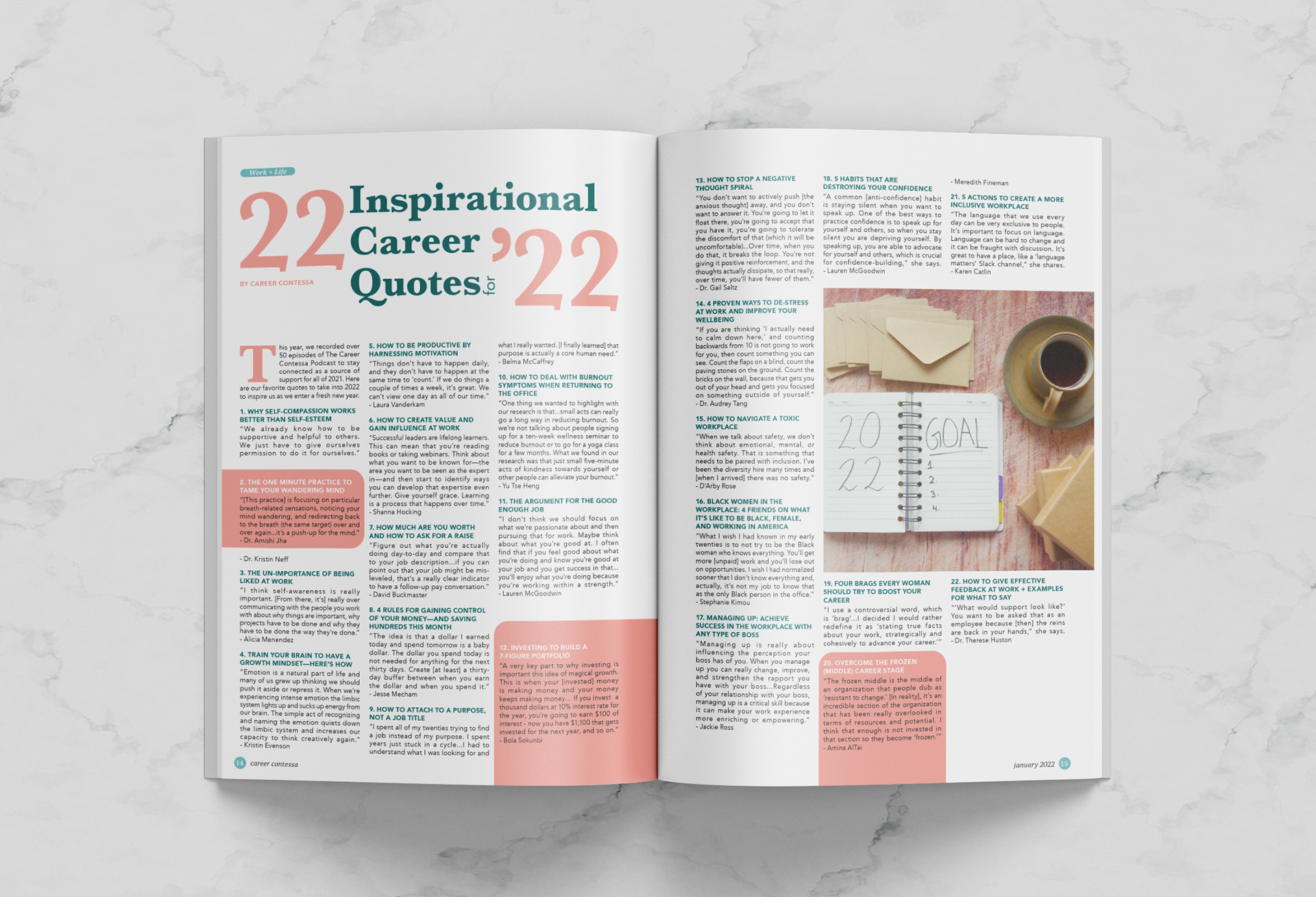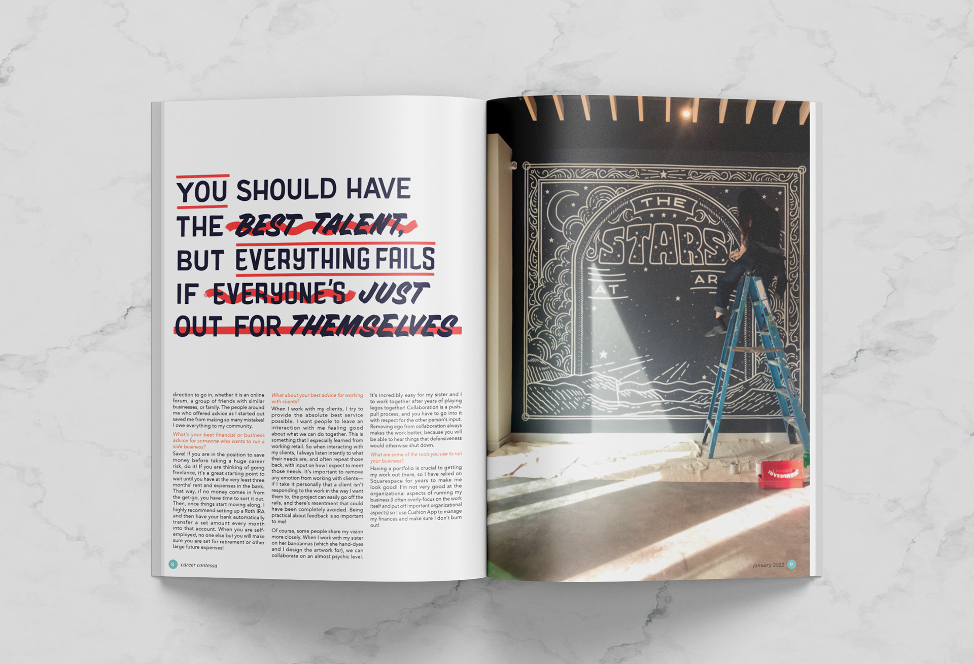 Career Contessa is originally an online blog dedicated to providing women with the tools and resources needed to build and balance a successful career. My goal with this project was to bring that digital community into the world of Women's Interest magazines. For the department pages, I wanted to create a layout that would allow the reader to breathe from time to time, especially since Career Contessa likes articles with a high word count. For the features, I tried to find a balance between the aesthetics of the stories and the magazine itself.